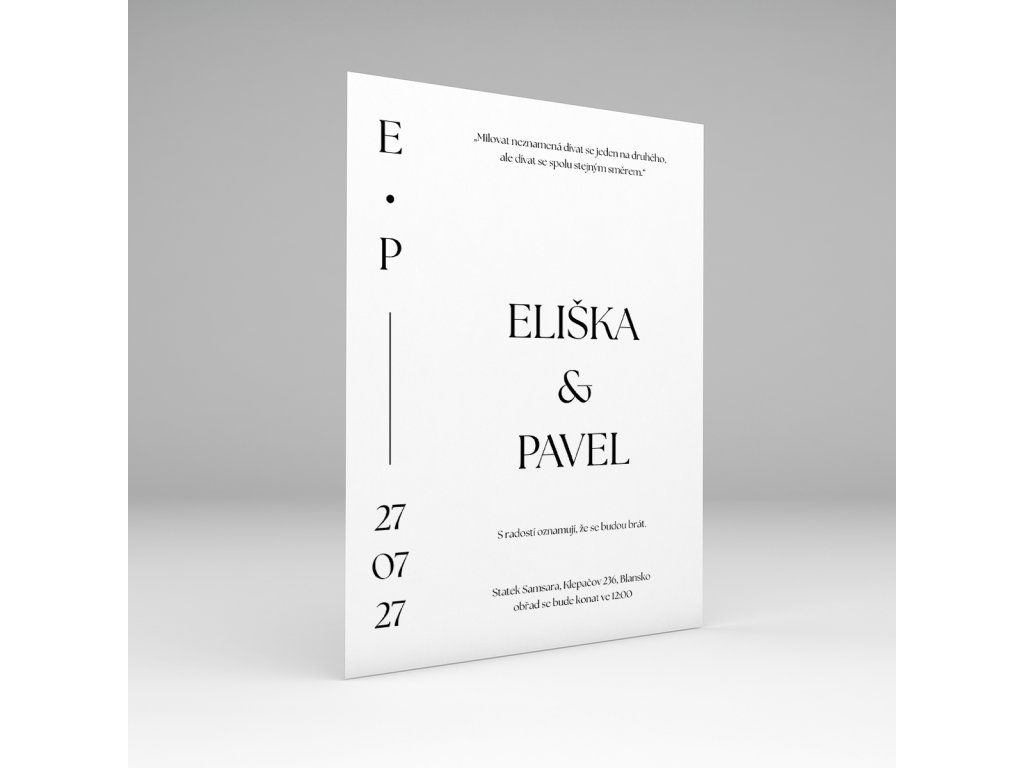 Toto oznámení neoslňuje barvami, ale precizní kompozicí. Moderní rozvržení textu s důrazem na iniciály a velkorysý bílý prostor dodává tiskovině nádech luxusu a klidu. Je to ideální volba pro svatby v moderních industriálních prostorech, stodolách nebo pro intimní obřady, kde vládne vkus a upřímnost.