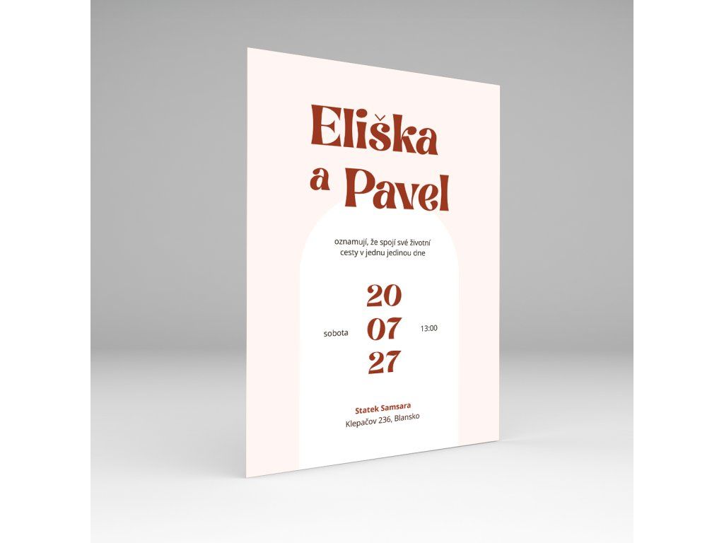 Hlavní roli zde hraje sofistikovaná souhra oblouků a výrazné typografie. Moderní psané písmo u vašich jmen tvoří krásný kontrast s čistým pozadím a dodává celému oznámení osobitost i lehkost. Je to design, který se neokouká a díky své nadčasovosti zůstane krásnou vzpomínkou na váš den i po mnoha letech. Každý prvek na kartě má své místo a společně tvoří dotažený celek, který působí luxusně a zároveň velmi osobně.